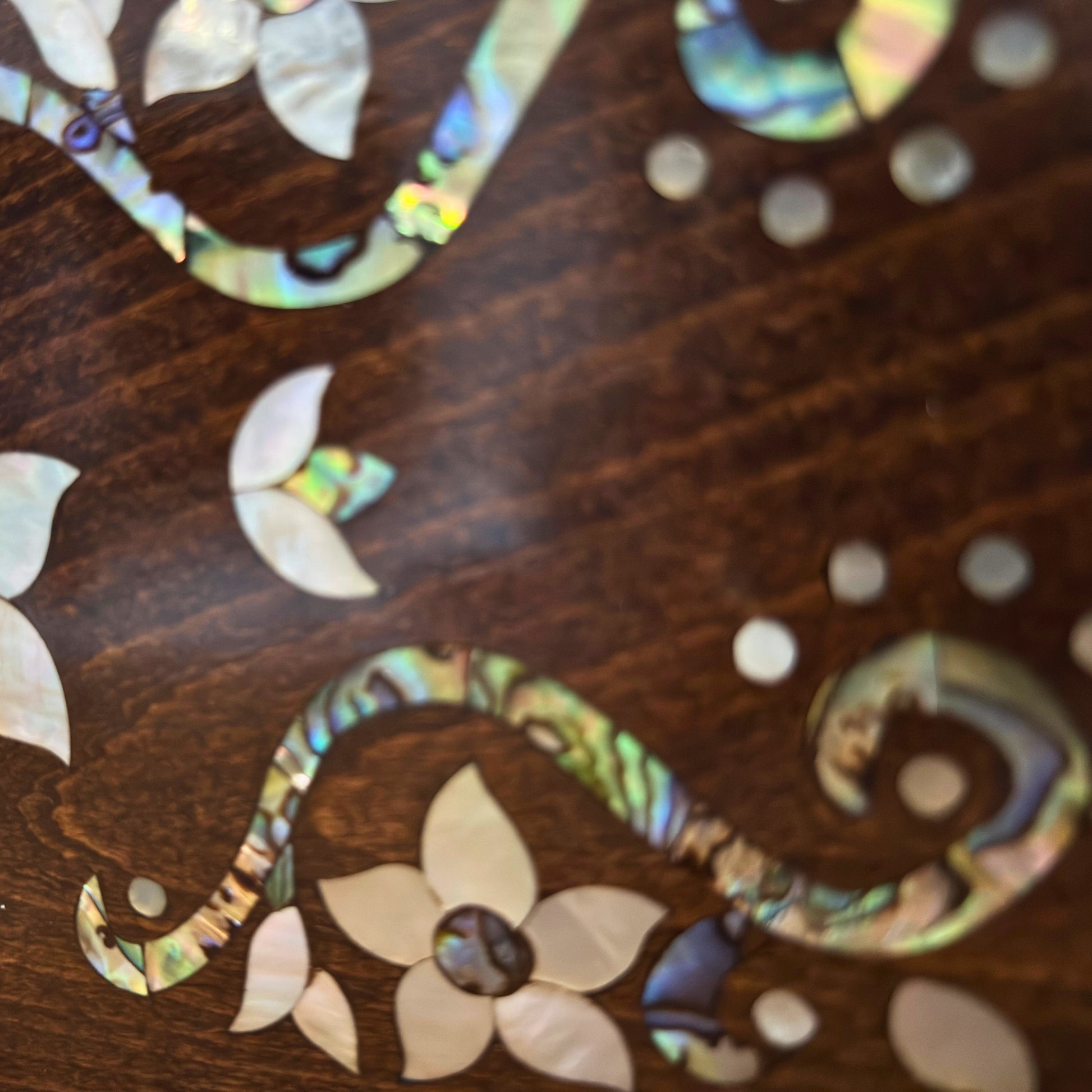 كل بتلة من الصدف مرصعة بعناية داخل خشب الجوز الفاخر، لتشكل لوحة متقنة من اللمعان والعمق المستوحى من الزخارف الدمشقية التقليدية.