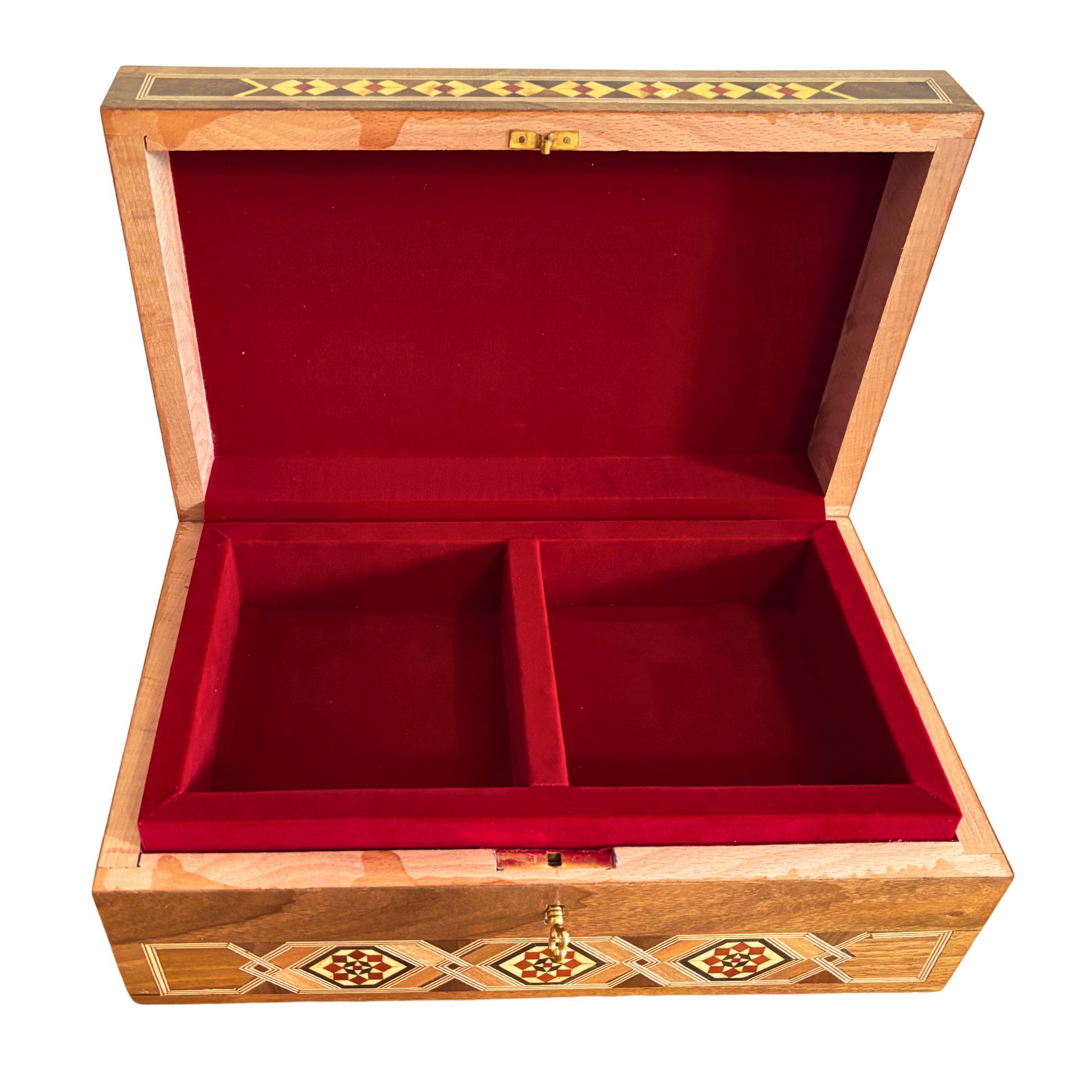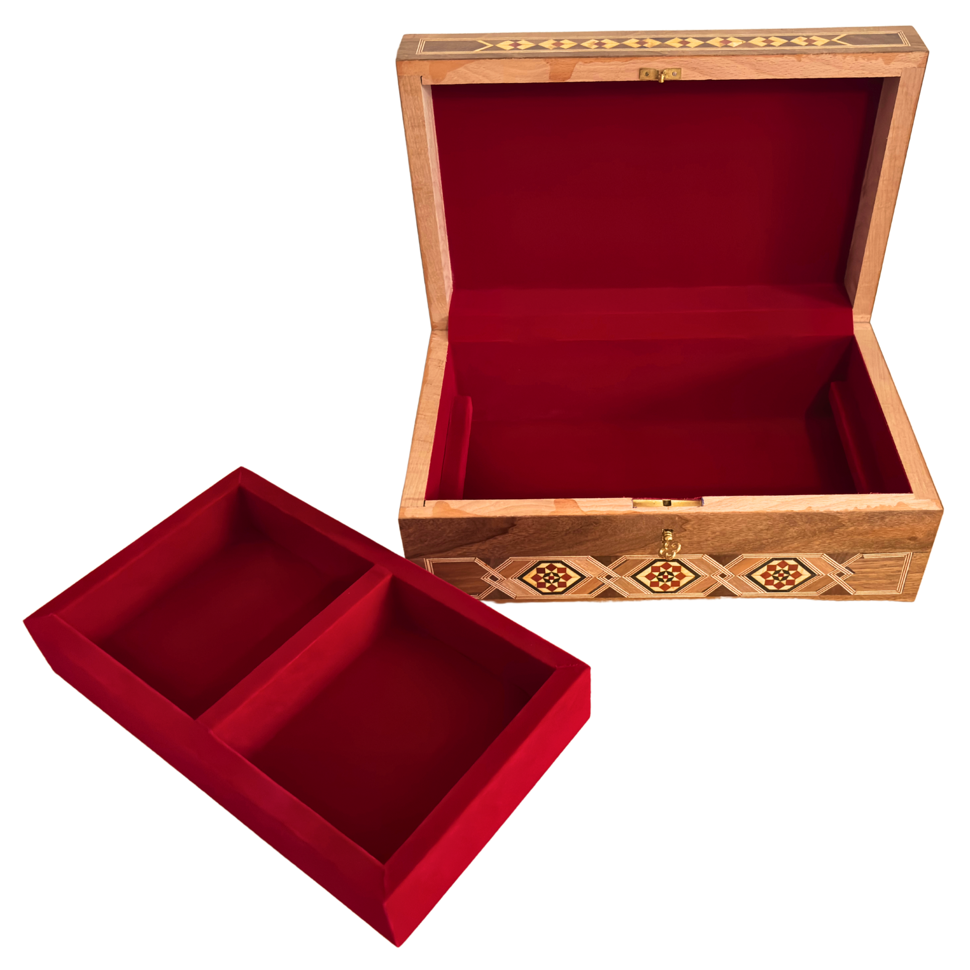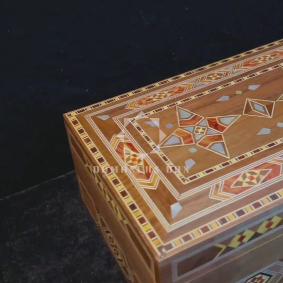 Esta caja grande de mosaico damasceno, hecha a mano, es una verdadera obra de arte, meticulosamente fabricada con madera premium de nogal, haya, limón y pino amarillo, e incrustada exquisitamente con madreperla brillante y patrones geométricos intrincados utilizando técnicas centenarias. Su interior multinivel ofrece un almacenamiento elegante y seguro para joyas, relojes, recuerdos y preciados momentos, todo protegido con una cerradura clásica y llave.