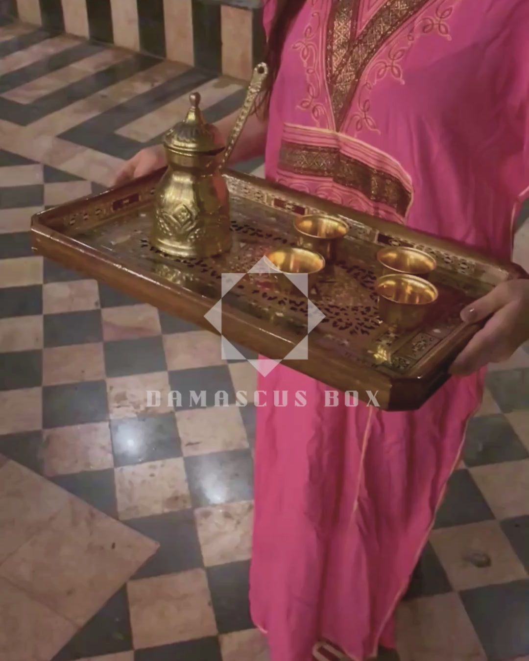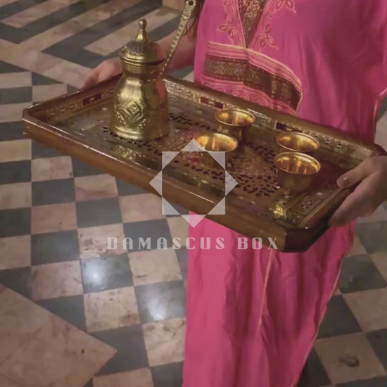 Questo elegante vassoio a mosaico artigianale rappresenta il meglio dell’arte damascena tradizionale.