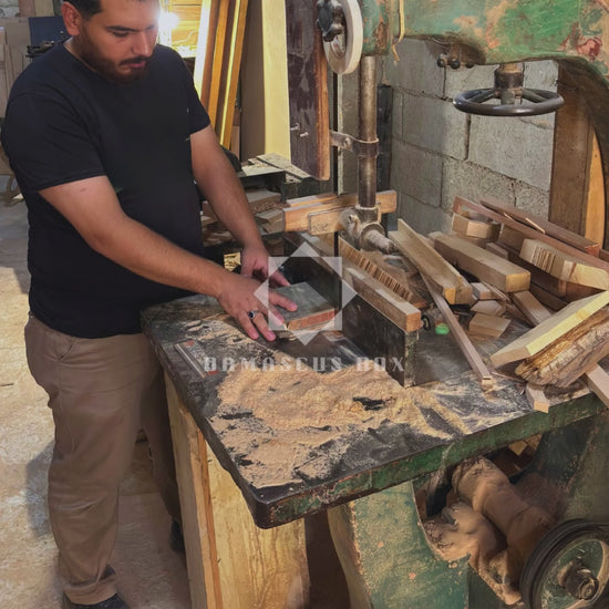 Il design intagliato e i toni naturali e caldi del legno evidenziano la maestria e la bellezza del mosaico damasceno.