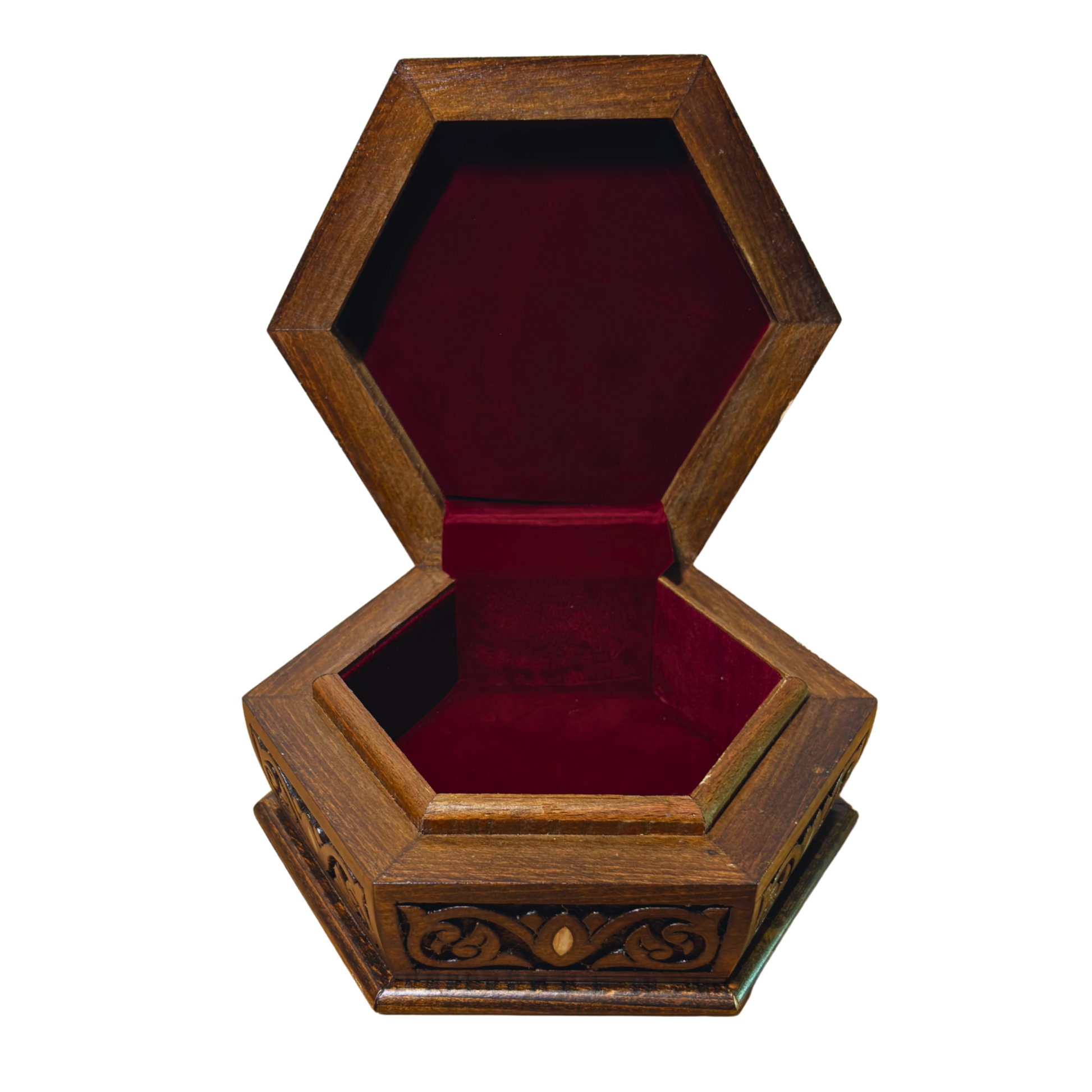 Finished in a dark walnut tone, the hexagonal form enhances the depth of the carving and the richness of the wood. The interior is lined with luxurious wine-red velvet, offering refined protection for jewelry, keepsakes, or treasured personal items.