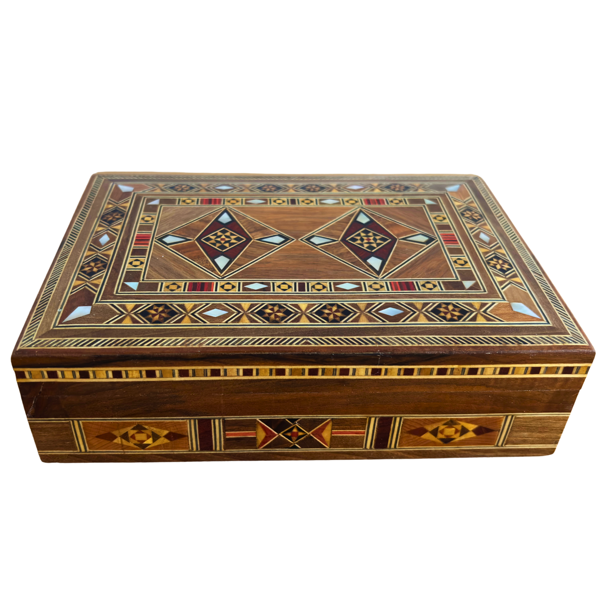 medium rectangular mosaic box, handcrafted Damascene box, mother of pearl jewellery box, wooden keepsake chest, Syrian mosaic craftsmanship, unique gift idea, wedding gift, anniversary present, artisanal storage box, Damascus box, Syrian box, gift for her, gift for him