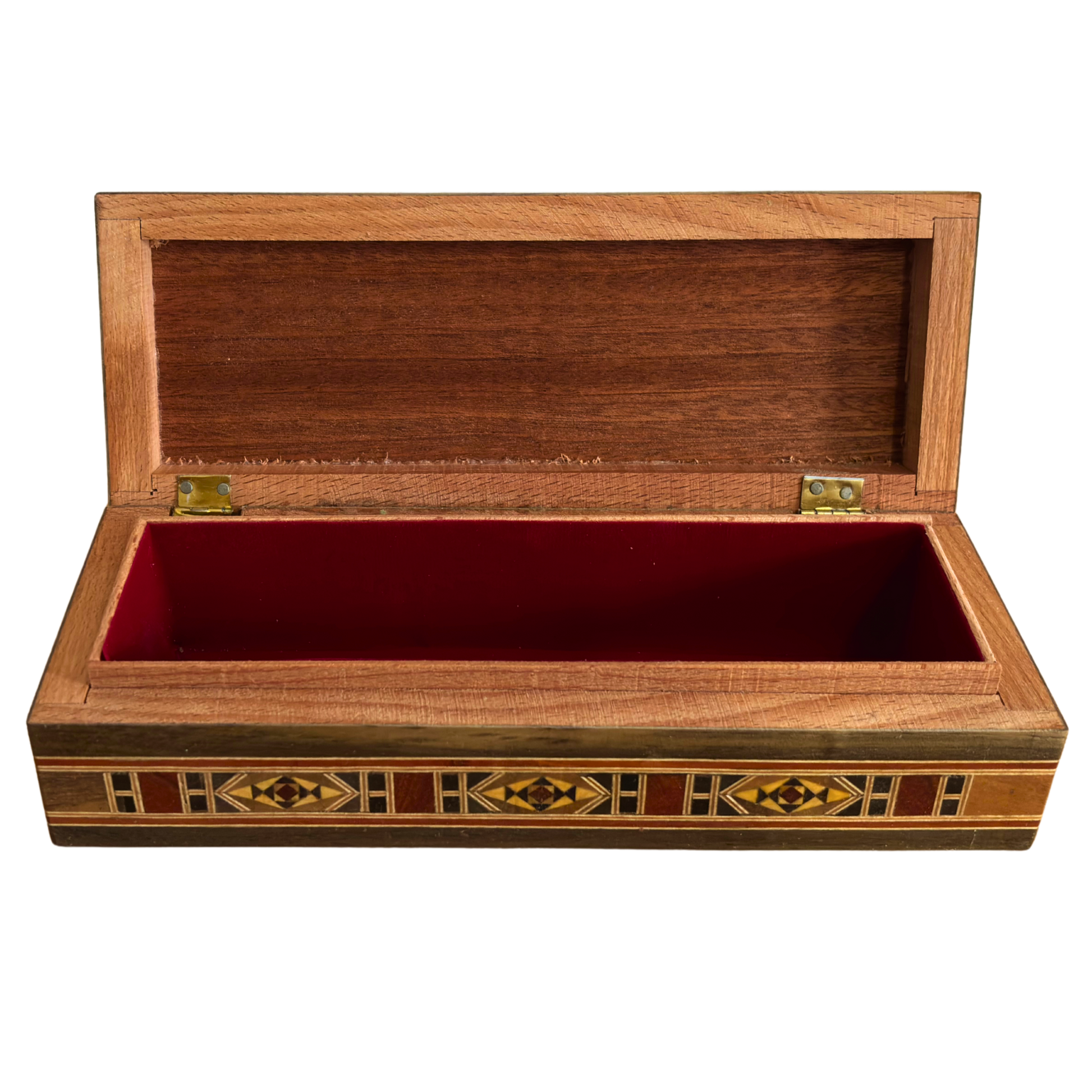 handcrafted mosaic wood box, long rectangular inlay box, mother of pearl pen box, Syrian mosaic jewellery box, wooden keepsake chest, elegant handmade gift, Arabic geometric décor, oriental art box, artisanal storage box, Damascus box, Syrian box, gift for her, gift for him