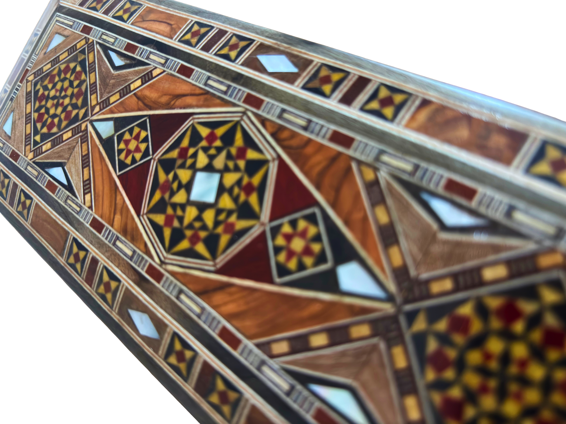 Elevate your space with this stunning handcrafted Damascene mosaic box, beautifully shaped in a long rectangular form that’s both practical and artistic. Made with care by skilled artisans using eucalyptus, walnut, rose, beech, lemon, and yellow pine woods, and inlaid with luminous mother of pearl, this box showcases traditional geometric mosaic patterns inspired by Syrian artistry.