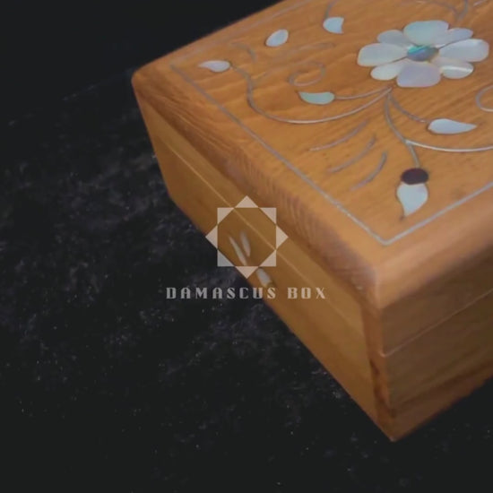 Handcrafted with a light walnut finish and adorned with authentic mother of pearl inlay, the box showcases extraordinary craftsmanship and timeless elegance. The interior is lined with luxurious wine-red velvet, offering both beauty and protection for your treasured pieces.